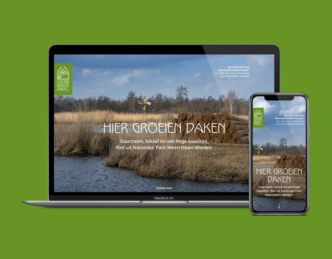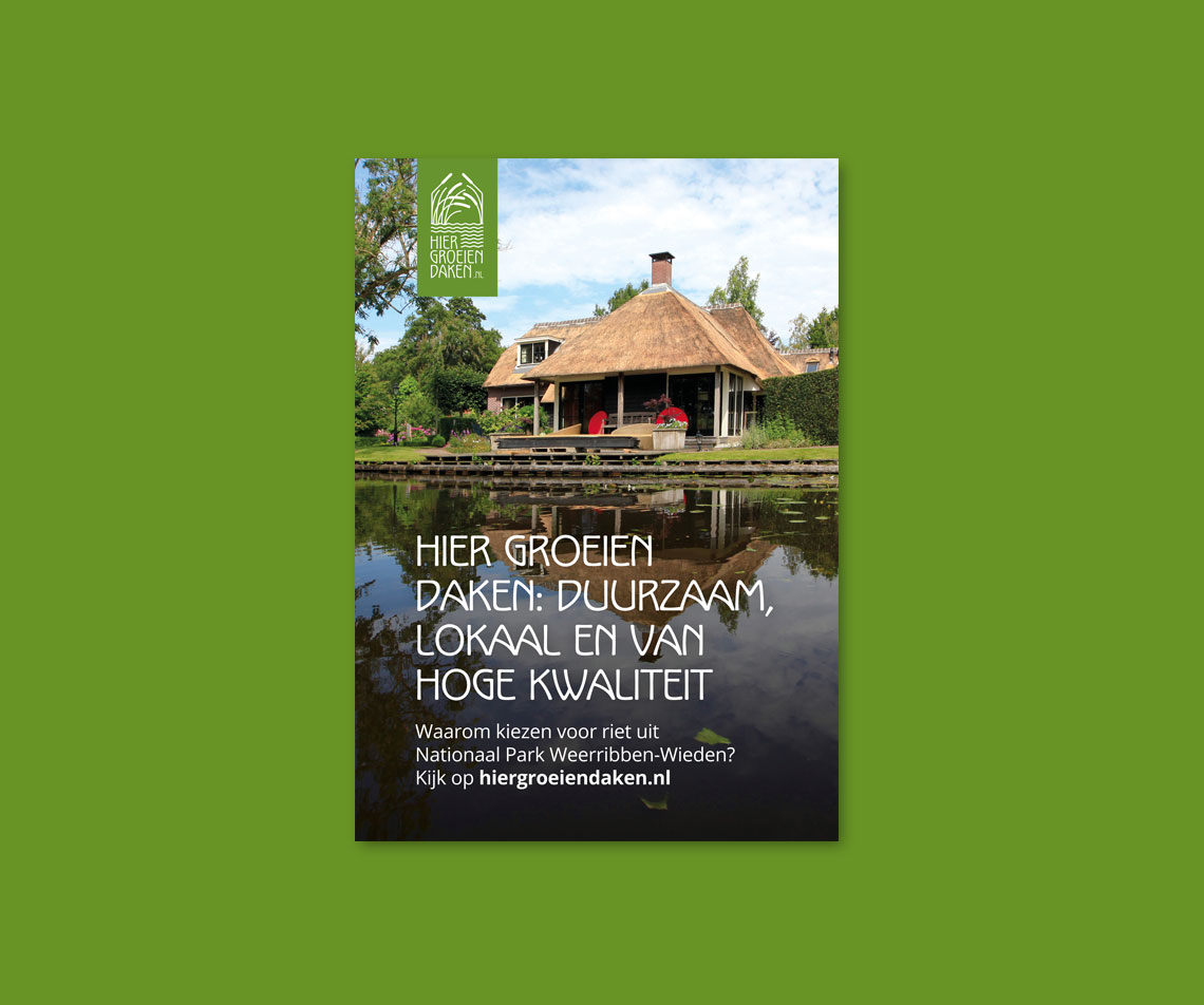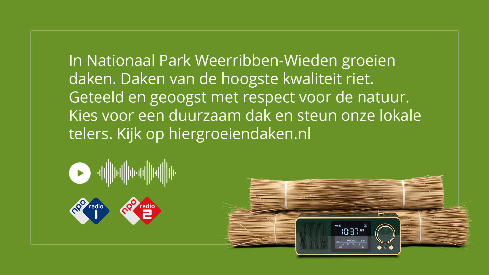 Met ‘Hier Groeien Daken’ brachten we daar verandering in. We maakten het zichtbaar. Hoorbaar. Voelbaar. Een radiospot op de STER met een speciaal gecomponeerd “Weerribben-Wieden-riet-lied”. Een herkenbare visuele stijl met logo en vignet. Een socialmediacampagne die bewoners, beleidsmakers en bouwprofessionals liet zien dat Wiedenriet meer is dan een product: het is erfgoed, economie en ecologie in één.